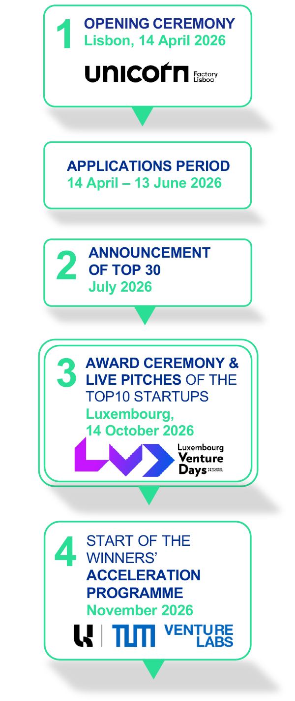 - The TOP 10 startups will be supported by our team, and benefit from an acceleration programme, powered by TUM Venture Labs.